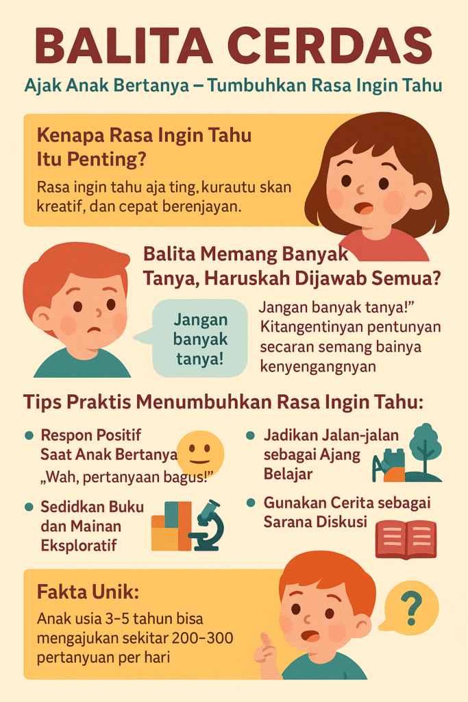 Anak usia 3–5 tahun bisa mengajukan sekitar 200–300 pertanyaan per hari. Otaknya sedang sangat aktif membangun logika, bahasa, dan imajinasi—fase emas untuk menumbuhkan keingintahuan.