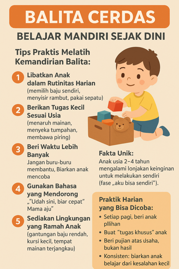 Anak usia 2–4 tahun mengalami lonjakan keinginan untuk melakukan sendiri (disebut fase “aku bisa sendiri”). Ini adalah momen emas untuk menanamkan kemandirian yang akan bertahan seumur hidup.